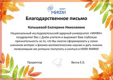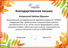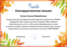 Учителя нашей школы - Гутник Г.М., Катышева Е.Н. и Богданова Л.Ю. получили Благодарственные письма от проректора Национального исследовательского ядерного университета "МИФИ" за то, что смогли сформировать у своих учеников интерес к физико-математических наук и дать знания, позволившие им успешно поступить и учиться в НИЯУ МИФИ.
