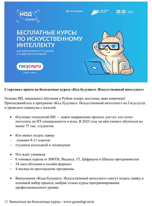 В рамках федерального проекта «Кадры для цифровой трансформации» национального проекта «Экономика данных и цифровая трансформация государства» реализуется проект «Код будущего. Искусственный интеллект», направленный на обучение школьников 8 – 11 классов технологиям искусственного интеллекта.