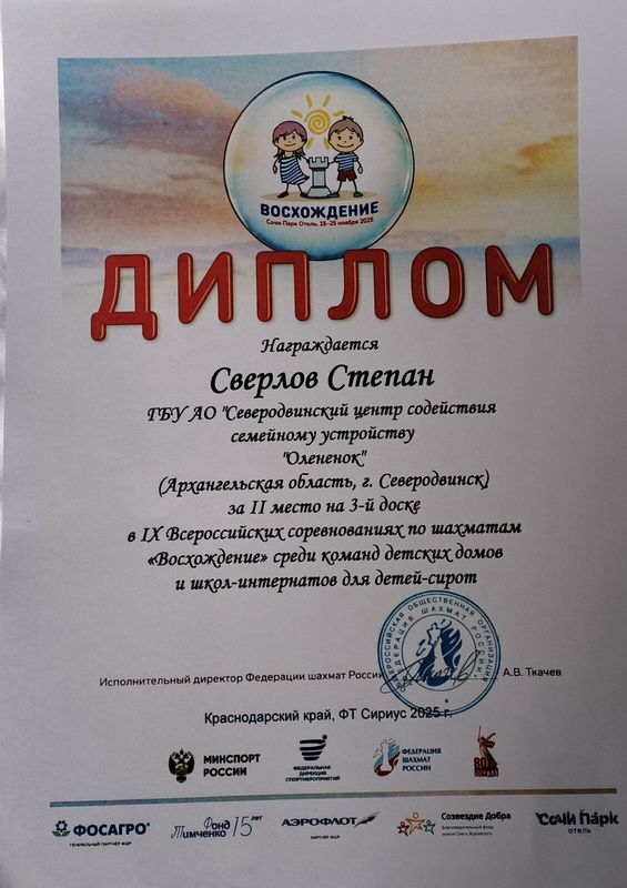 С 15 по 25 ноября в Сочи прошли IX Всероссийские соревнования по шахматам «Восхождение» среди воспитанников детских домов и школ-интернатов. В этом году турнир собрал 39 команд из 28 регионов, объединив 156 юных шахматистов. Среди представителей от Архангельской области был обучающийся нашей школы - Степан С.
