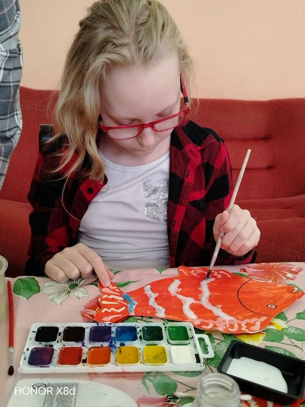Погружаясь в солеварный промысел, дети создали яркую северную рыбу на мастер-классе по рисованию солью.